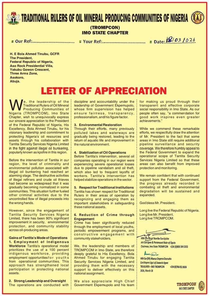 News Letter of Appreciation By Traditional Rulers of Oil Producing Communities of Nigeria By Nigeria Newsbite On Mar 27, 2026 0 Continue Reading 0 Share FacebookTwitterWhatsAppEmailLinkedin